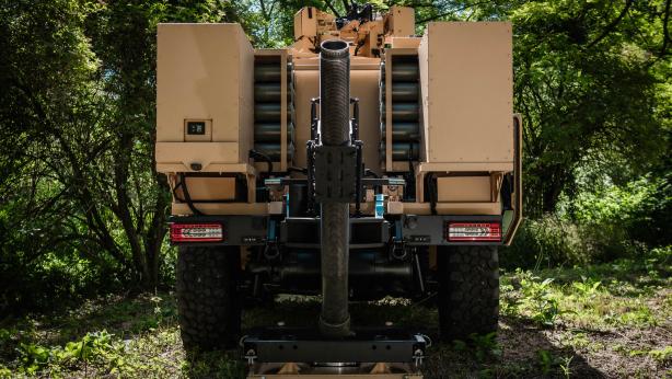 The Sherpa A2M combines the excellent mobility of a Sherpa Light, the proven Deployable Mortar System by NTGS and the 120mm rifled mortar barrel by Thales, into one full fully integrated new solution.